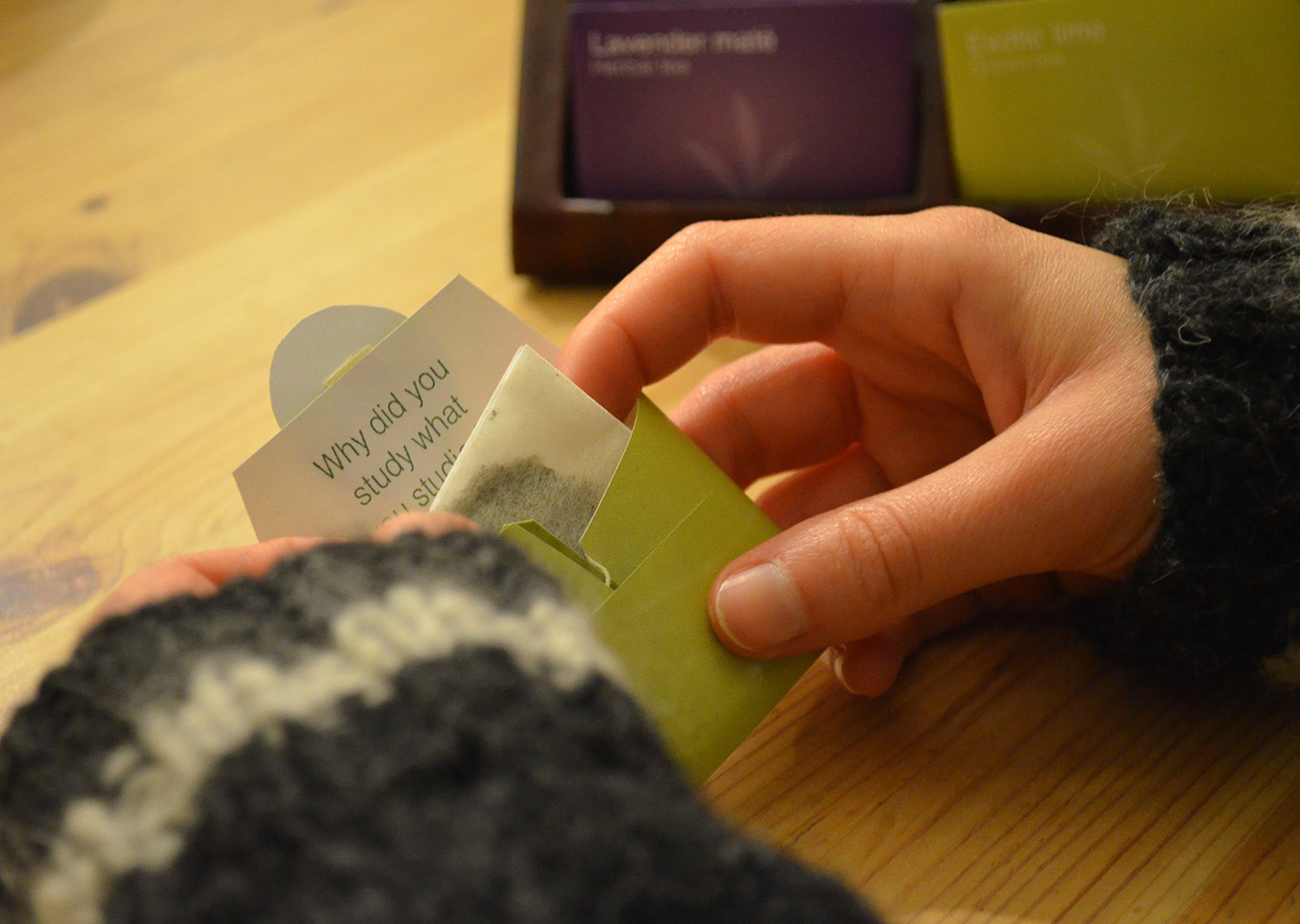 “From me to me” offers to seniors approaching retirement, small opportunities within their routines to reflect on aspects of life that will become more central during the retirement years. It consists of a tea box, a box to store personal thoughts and very intriguing tea bags with hidden questions inside.