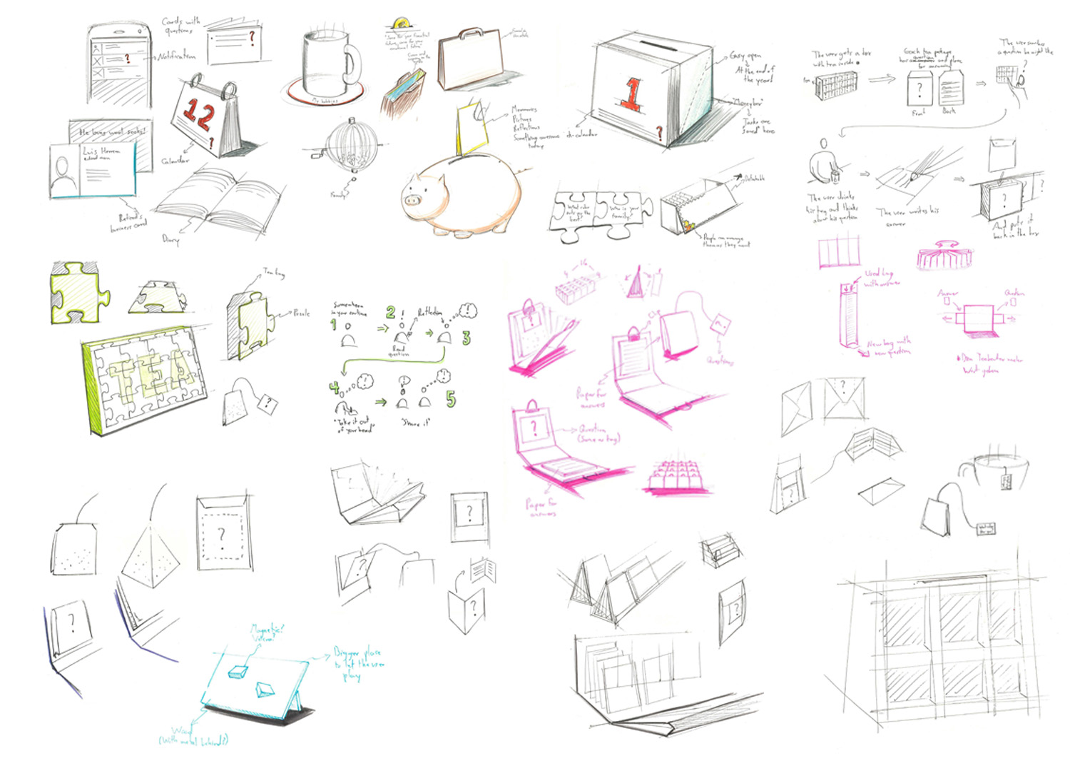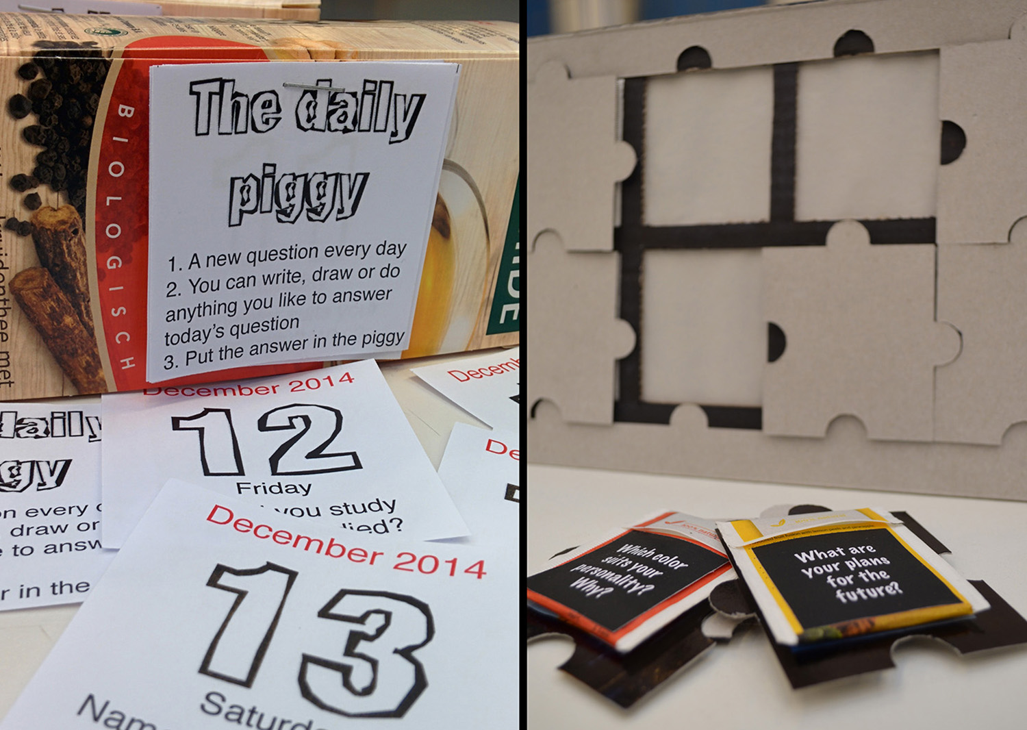 It uses a natural pause in the routine to trap the user by a few seconds in a reflection state. Opening the tea bags, which are small envelopes, is a careful and surprising experience. While opening these envelopes, the first thing that the user sees is a question that triggers him to reflect. The question is also present while drinking the tea in the tea tag. A writing space in the envelope invites him to make his thoughts concrete or put something inside it, and put it in the box. With the time, “From me to me” will become a personal diary with new insights to build a good life after retirement upon.